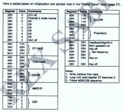 Armed with a z80asm assembler, Echo’s source, and SEGA’s Mega Drive Programming Manual, I managed to follow the example register table for a single piano note: