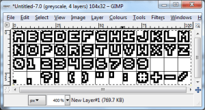 The font needs to be perfectly legible at a size of 7×7 (8×8 tiles, but leaving a one-line space). It wasn’t easy to find one that matches the specification that’s also free to use, but low and behold I found an absolute beauty – a 7×7 pixel font under the Creative Commons license (link to the font and license in references section):