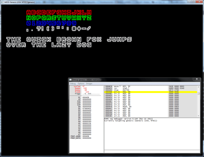 Hopefully it should be self-explanatory, with the exception of that move.b  (a1,d2.w), d3 line. The parenthesis mean to offset the source address of the move command – so we’re moving the byte at address a1 + d2 to d3. This is how array access is done in 68k assembler. I haven’t yet tested, but I’m assuming the same can be done for the destination addresses, so offsets into the array can be written to as well.