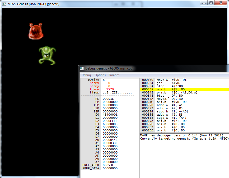 Just for good measure, I’ve added another monster friend to demonstrate drawing two sprites, making sure to set the next sprite ID in the linked list, and terminating the second sprite with a 0: