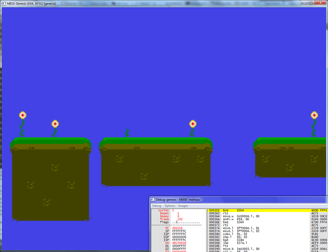 This is all very primitive, though. It’s a relatively tiny map when compared to most scrolling Megadrive games, and since 128 tiles is the widest we can go then we’d need some method of streaming in new map data offscreen whilst scrolling. I’d also like to mess with per-pixel line scrolling and create a water effect at some point, but this will do for now.