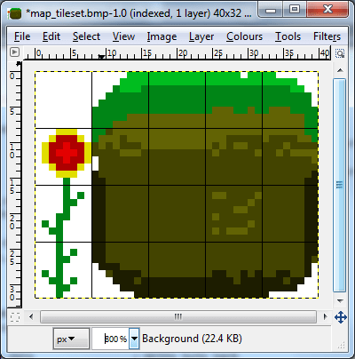 First, I need some test data. I spent an evening hand crafting a basic tileset which could be used for a simple platform game – four rounded corners, green grassy top, with various soil tiles and even two plants. Not bad for the world’s worst artist, I think: