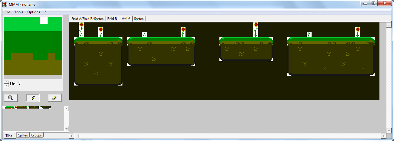 The idea is to forward plan the re-use of each tile. Ignoring the flower for a minute: the 4 border tiles either side can only be used at the sides of one platform island, but the two centre columns of soil/grass can be placed many times in the middle to make the island longer or shorter. The one odd soil tile (two from the bottom, two from the right) can be dotted around the island to make large areas of soil less repetitive. Well, that’s the idea, if it was executed better and perhaps with a bigger tileset, but I’m keeping it simple for the learning process. The flower can either be very tall, as presented in the tileset itself, or just the top two tiles could be used to make a short flower. The two stem tiles themselves could be used alone to make a small headless plant, too. The possibilities are… not exactly endless… but with only 20 tiles we can now make something which would pass as a platformer. Notice the very first tile has been left empty, this is to ensure the whole screen doesn’t get filled with some data when the tileset is copied to VRAM, as well as defining the “blank” tile for MMM.